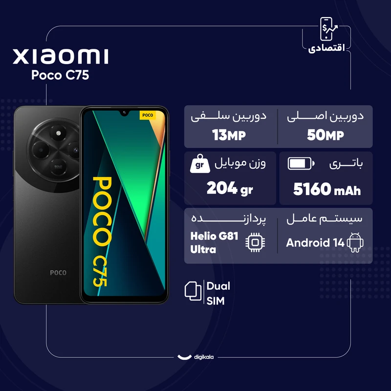 گوشی موبایل شیائومی مدل Poco C75 یکی از جدیدترین محصولات سری محبوب پوکو است که با ظرفیت ذخیره‌سازی 256 گیگابایتی و هشت گیگابایت رم به کاربران عرضه شده است. این گوشی با طراحی جذاب و شیک خود، در سه رنگ مشکی، سبز و طلایی وارد ارائه شده و به دلیل بدنه شیشه‌ای و وزن 204 گرمی، حس خوشایندی به کاربران القا می‌کند. همچنین، نمایشگر 6.88 اینچی این گوشی از نوع IPS LCD است که نرخ تازه‌سازی 120 هرتز و روشنایی 600 نیتی را برای تجربه بصری روان و واضح در اختیار کاربر قرار می‌دهد. در کنار این نمایشگر با کیفیت، چیپست MediaTek Helio G81 Ultra و پردازنده هشت‌هسته‌ای با معماری 12 نانومتری، عملکردی سریع و پایدار را تضمین می‌کنند. این دستگاه مجهز به دوربین اصلی 50 مگاپیکسلی و دوربین سلفی 13 مگاپیکسلی است که امکان ثبت عکس‌های خیره‌کننده و فیلم‌برداری با وضوح 1080p را فراهم می‌آورد. باتری 5160 میلی‌آمپر ساعتی با قابلیت شارژ سریع 18 وات، نیاز شما به انرژی را به‌خوبی تأمین می‌کند. با رابط کاربری HyperOS بر پایه اندروید 14، تجربه‌ای مدرن و کاربر پسند در استفاده از این دستگاه خواهید داشت. در مجموع پوکو C75 یک اقتصادی است که به مشخصات میان‌رده مجهز شده و به همین دلیل ارزش خرید بالایی دارد.